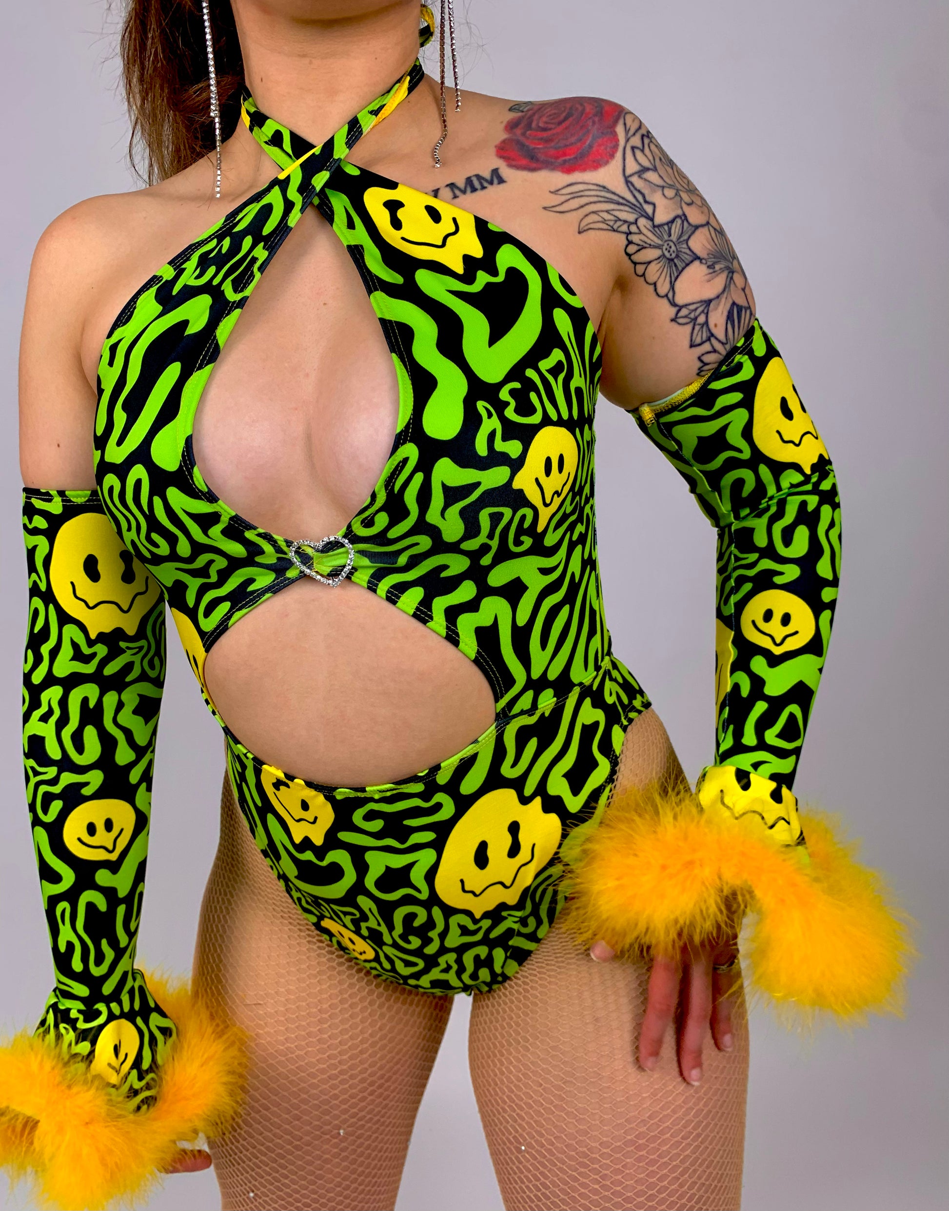Made out of spandex material, swim safe. Please hand wash in cold water and let hang dry.